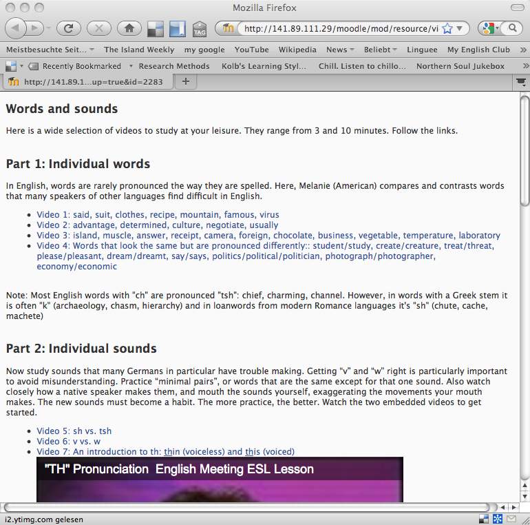 To teachers: I posted this on Moodle for self-study (see screenshot of the top part of the web page). For those of you using Moodle with college students and thinking about how to layout a page, here’s food for thought: Pages load far more slowly when videos are embedded in them, and wifi connections at universities may be slow. I make long pages rather than many short ones, since users prefer to scroll down to check how much there is, which means a lot of data is being loaded at once. So Not to try my students’ patience, I didn’t embed most of the videos, just provided a link. I actually only embedded them here and there, after I saw my (impatient and honest) husband just check the first couple of links, which go to very similar videos, so he missed the more entertaining ones in the second half.